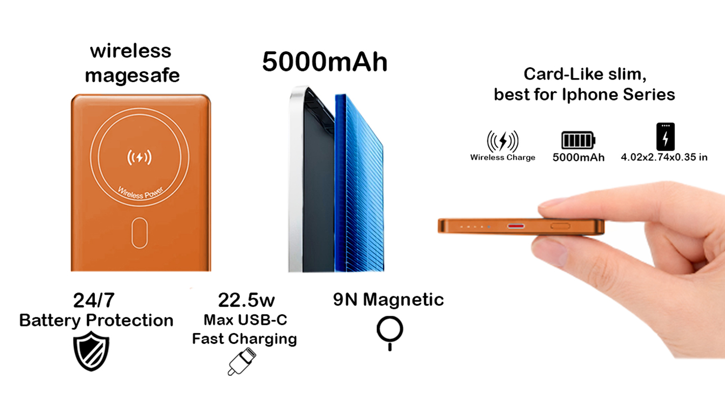 • 0.34-inchUltra slim magnetic power bank, delivering 5,000mAh of dependable charging