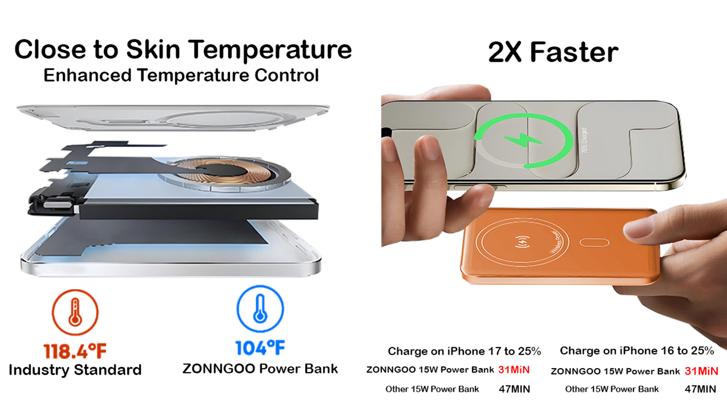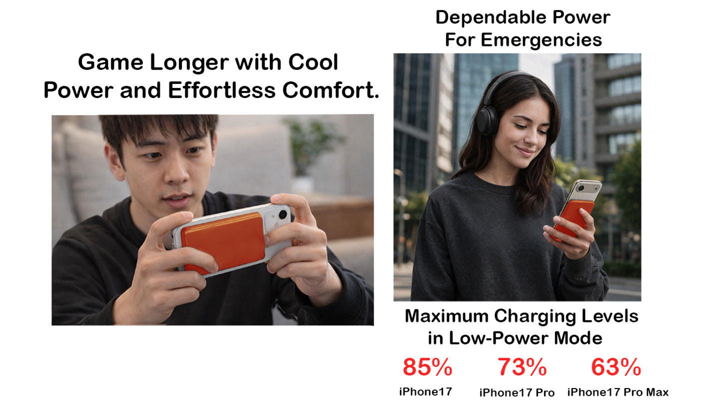 • 15W Max MagSafe-compatible fast charging,quickly powering up an iPhone 17 Pro to 25% in just 34 minutes.(Data based on internal lab tests; actual charging performance may vary.)