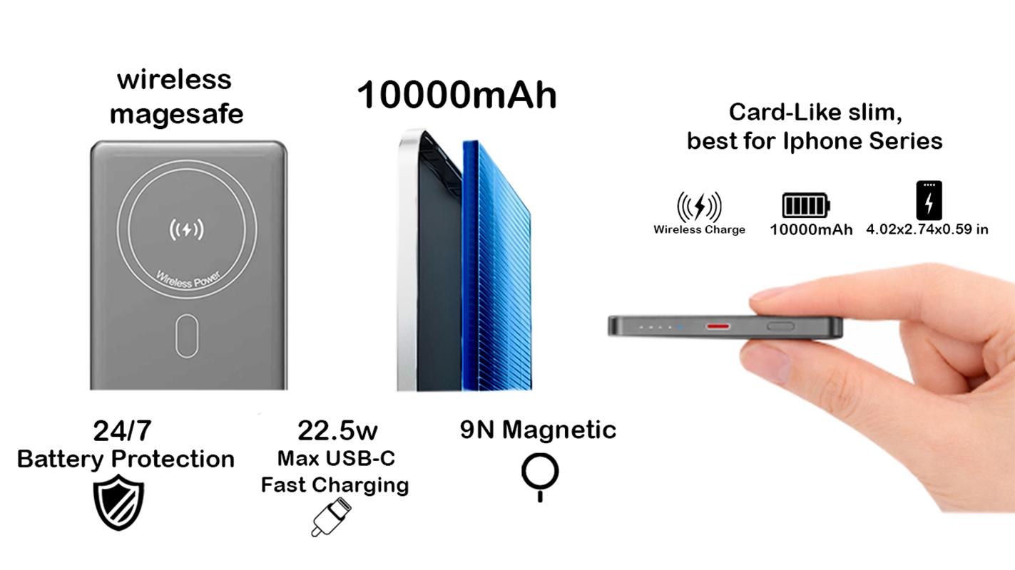 • 0.59 inch Ultra slim magnetic power bank, delivering 10,000mAh of dependable charging