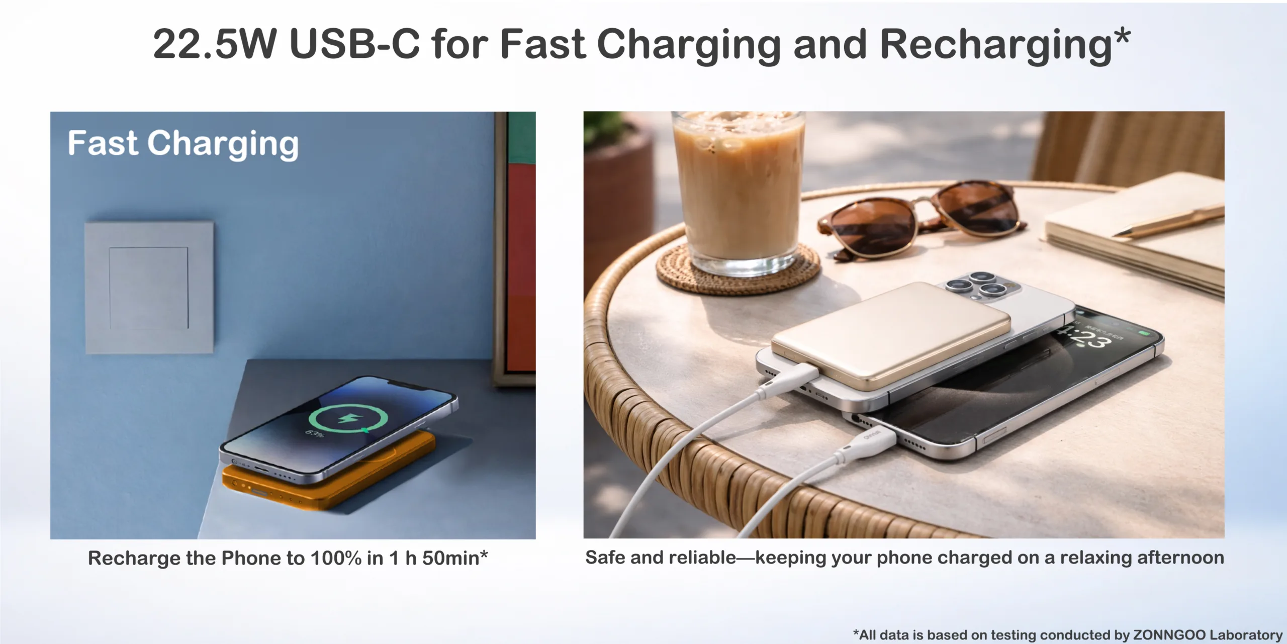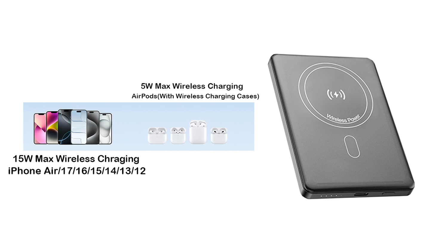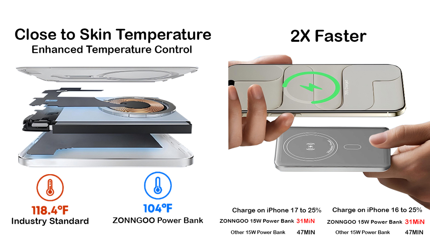 • 15W Max MagSafe-compatible fast charging,quickly powering up an iPhone 17 Pro to 25% in just 34 minutes.(Data based on internal lab tests; actual charging performance may vary.)